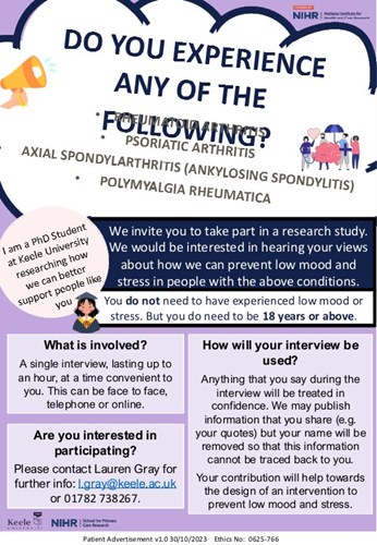 Description of activity: Taking part in this research will consist of a single 60 minute interview which can be done either by telephone or video call. This will explore experiences and views about challenges faced living with psoriatic arthritis, and how we can prevent anxiety and depression in people with these conditions.