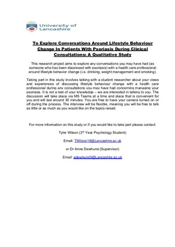 Recruit criteria: Patients who have a diagnosis of psoriasis and have had conversations with health professionals about lifestyle behaviour change.